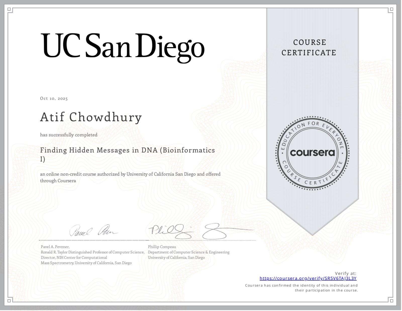 Issued by: Coursera (University of California San Diego) .