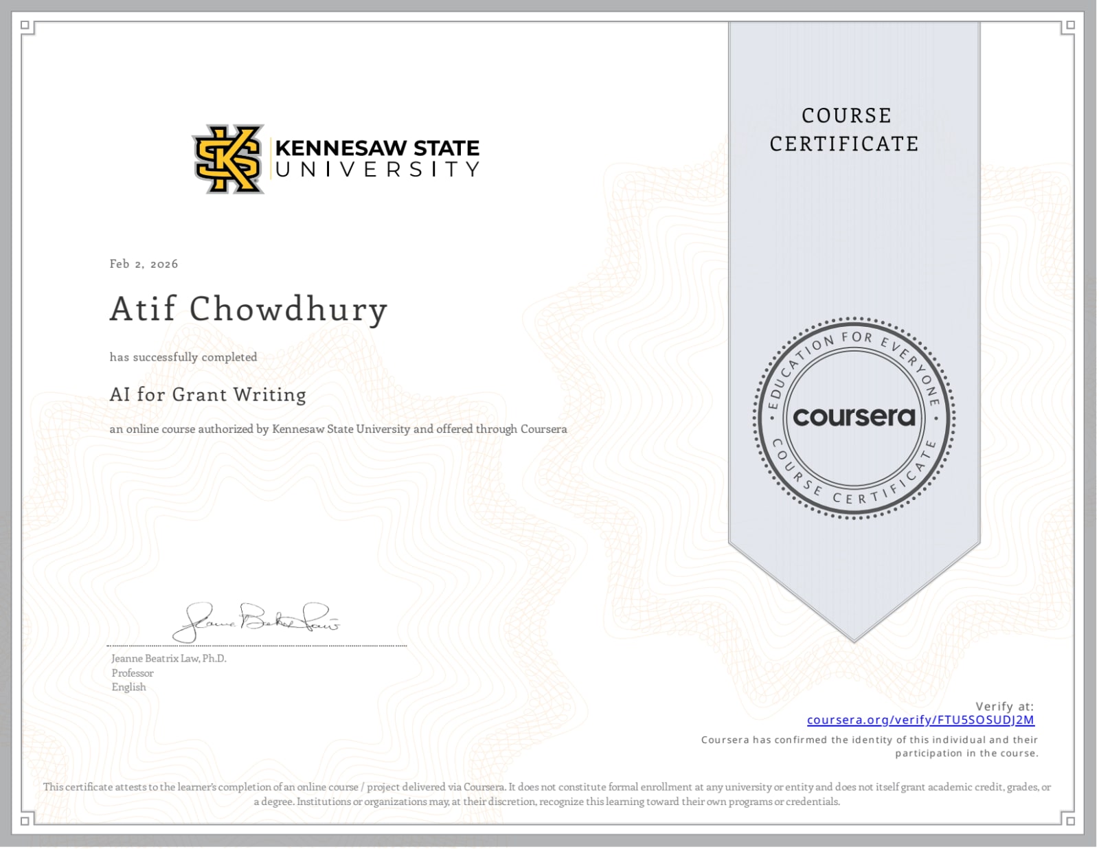 Organization: Coursera (Kennesaw State University) .