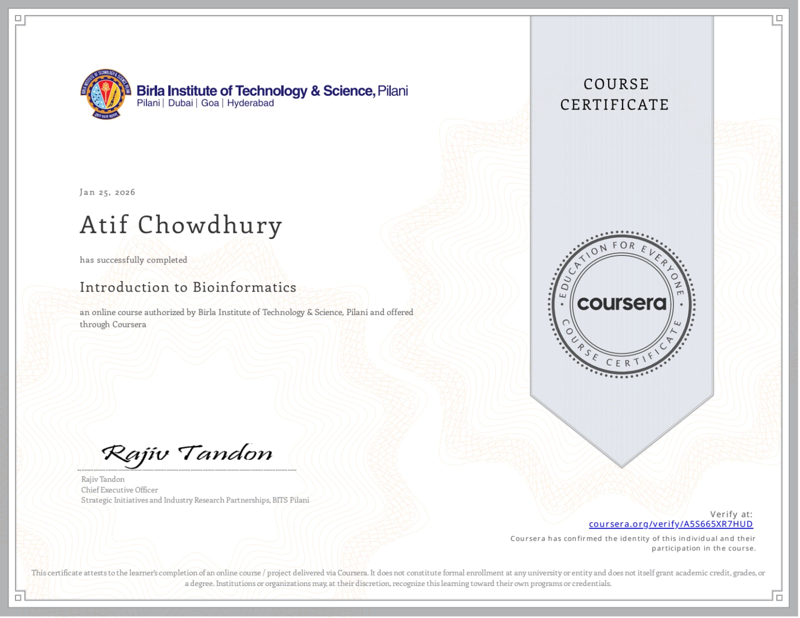 Issued by: Coursera (BITS, Pilani) .