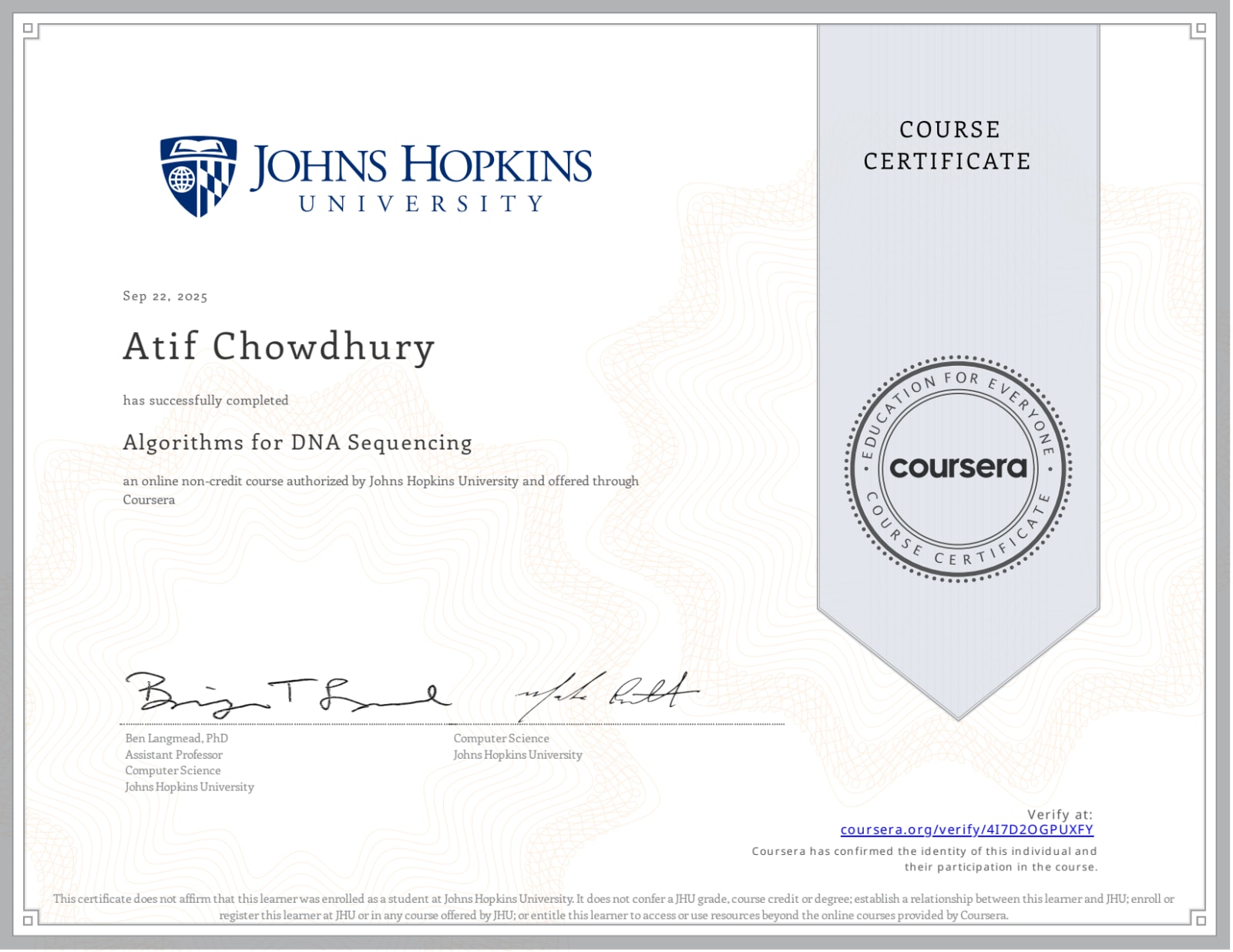 Description:This course, "Algorithms for DNA Sequencing," provides an overview of the computational methods used to analyze data generated by DNA sequencing technologies. It covers the algorithms and data structures applied to fundamental problems in genomics.